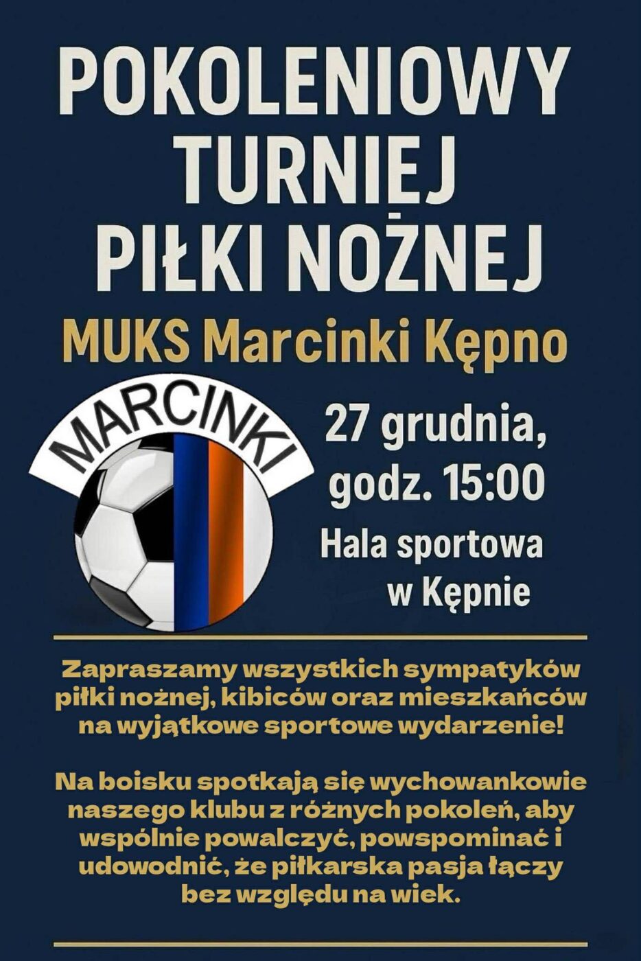 Zawodnicy, którzy niegdyś reprezentowali barwy MUKS Marcinki Kępno spotykają się „po latach” już w najbliższą sobotę (27/12). Zapraszamy do wspólnego kibicowania na trybuny hali widowiskowo-sportowej!